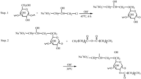 Due to the similarity with the polyethylene terephthalate, eco-friendly nature, and ease of processing, polylactic acid (PLA) obtained from renewable resources has been extensively explored for fiber applications [19]. Currently, PLA warps or PLA filaments must be sized before the weaving process, due to poor cohesion, loose tows, and the easy occurrence of entanglement and bonding. Therefore, it is an urgent requirement to explore a new chemically modified starch for the use in sizing PLA warps or PLA filaments. Apparently, hydrophobic substituents that contain ester groups will favor an increase in the van der Waals forces at the interface between starch adhesive layers and PLA fibers due to the chemical similarity with the carbonyls in the PLA molecular chains, thereby being expected to improve the adhesion. However, an excessive increase in the introduction of the hydrophobic substituents can reduce the water-dispersibility and adversely affect the adhesion of starch to fibers since the paste applied for sizing warps is only a water-based adhesive. To overcome this drawback, which arises from the introduction of hydrophobic substituents, an alternative may be the introduction of hydrophobic and hydrophilic substituents into the starch molecules, simultaneously. The 3-propanesulfonic-2-hydroxy (PSH) substituents and caproates as the hydrophilic and hydrophobic substituents, respectively, can be derivatized into the starch molecules by hydroxypropylsulfonation and caproylation. The carbonyls in the caproates are chemically similar to the carbonyls in PLA molecular chains. In our previous work [20], hydroxypropylsulfonation of starch was employed to improve the adhesion of starch to cotton fibers. We found that the modification could improve the adhesion due to the improvement in the water-dispersibility of the starch after the introduction of PSH substituents. Moreover, PSH substituents and caproates with a large space volume can display strong steric restriction for interfering with the parallel arrangement of starch amyloses, partly mitigating the re-association of starch hydroxyls, and retarding the retrogradation of the paste during the formation of starch adhesive layers or starch films. Consequently, the restriction [21] can provide a plasticization for the layers or films, thereby lowering their internal stresses [22]. As a result, improved adhesion of starch to PLA fibers and a lowered brittleness of starch film may be expected, after the introduction of the PSH substituents and caproates. For these reasons, hydroxypropylsulfonation and caproylation were employed to derivatize the starch in this work. The chemical structure of hydroxypropylsulfonated and caproylated cornstarch (HCS) investigated is described in Scheme 1.