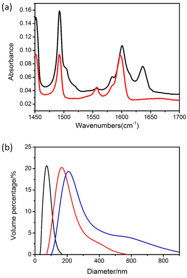 (a) The FT-IR spectra of the micelles of PS-b-P4VP-2 before (red) and after (black) complexing with ferric ions. (b) The size distribution curves of the polymeric composite micelles dispersed in water. The curves correspond to PS-b-P4VP-3 (black), PS-b-P4VP-2 (red) and PS-b-P4VP-1 (blue), respectively.