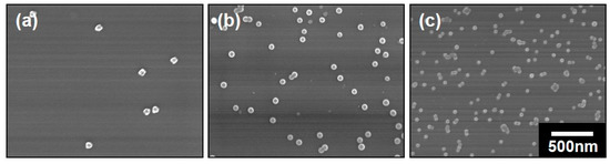 SEM images of the polymeric composite micelles prepared from (a) PS-b-P4VP-1, (b) PS-b-P4VP-2 and (c) PS-b-P4VP-3. All of the images have the same magnification and the scale bar is shown in (c).