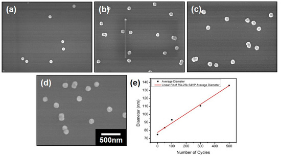 SEM images of the nanospheres of PS-b-P4VP-1 subjected to TiO2 deposition for (a) 50, (b) 100, (c) 300 and (d) 500 cycles, respectively. All of the images have the same magnification and the scale bar is shown in (d). (e) The plot of the diameters of the nanospheres with the number of ALD cycles.
