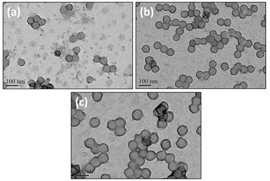 TEM images of the nanospheres of PS-b-P4VP-1 subjected to TiO2 deposition for (a) 0, (b) 50 and (c) 100 cycles, respectively.