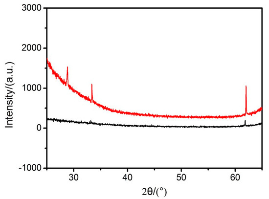 Comparison of the XRD patterns of silicon wafers (black) with the hollow nanospheres of PS-b-P4VP-1 after calcination (red).