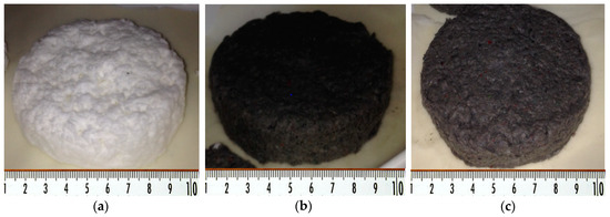 Foam can be made in many ways [53,54,55]. In our study, foam was generated using an axially agitated mix. The cellulose fibers (i.e., virgin cellulose fibers and recycled fibers) with a pre-determined weight to obtain a slurry pulp with 2.0% consistency, were soaked overnight (24 h) in distilled water with 1% sodium hydroxide (1N concentration). Then, the pulp slurry was mixed at high shear velocity (2000 rpm) for 15 min. Before mixing, 2% wt (to the pulp weight) surfactant SDS was added. The dispersion of foam was mixed until 60% air content was obtained. The air content from pulp foam dispersion was periodically calculated during the agitation process by comparing the mass of a known volume of foamed slurry pulp (mfoam) to the mass of the fiber/water suspension. Mpulp was required to obtain the same volume (1 − (mfoam/mpulp)) [56]. The foam and fibers suspension were filtered and dewatered using a Buchner funnel (15 cm diameter) with a filter paper at the bottom. The filtering was developed at a low level and vacuumed for approximately 20 min. Dewatered FCM with wet structure is presented in Figure 1 [36].
