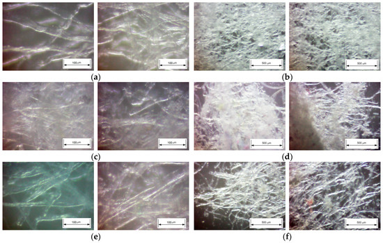 Optical micrographs of foam/water formed cellulose materials: sample P1 with magnification 350x (a) and 80x (b); sample P3S with magnification 350x (c) and 80x (d); sample P4 with magnification 350x (e) and 80x (f).