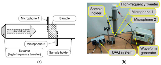 A schematic diagram of the method (a), in addition with an image of the laboratory setup (b), is depicted in Figure 4. It was used an ultrasonic tweeter, able to provide a high range of frequency, up to 40 kHz, mounted on a side of a sample holder tube. The sample holder enables the measurement of the incident and transmitted wave near the both sides of the material sample. The setup has to provide aligned centers of sound transducers, as well as sample and ultrasonic wave generators. Considering the speed of sound c0, the microphones diameter dm, the sample thickness d, and evaluated the time delay Δt, the tortuosity results by the expression: