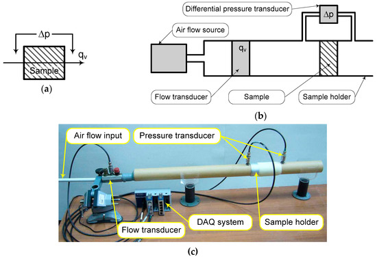 Experimental laboratory setup for airflow resistivity evaluation: (a) Basic principle; (b) schematic diagram of the experimental setup underlining the main parts; and (c) general view of laboratory setup with component parts marked on picture.