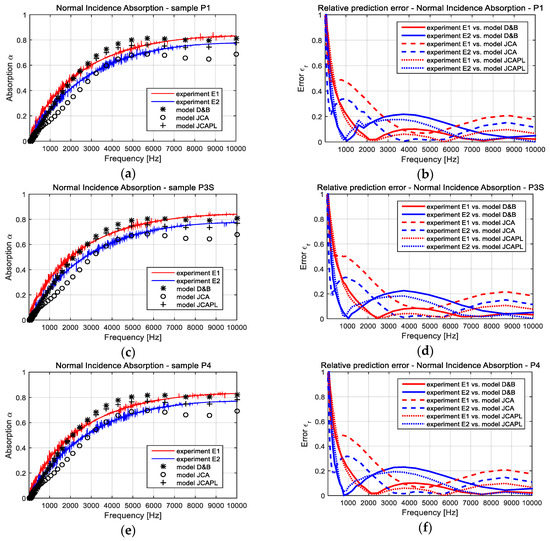 Comparative results between experimental evaluated and, respectively, computational estimated normal incidence absorption coefficients: (a) Absorption for sample P1; (b) Relative prediction error for sample P1; (c) Absorption for sample P3S; (d) Relative prediction error for sample P3S; (e) Absorption for sample P4; (f) Relative prediction error for sample P4. The significations of the symbols within graphs were mentioned on each diagram legend.