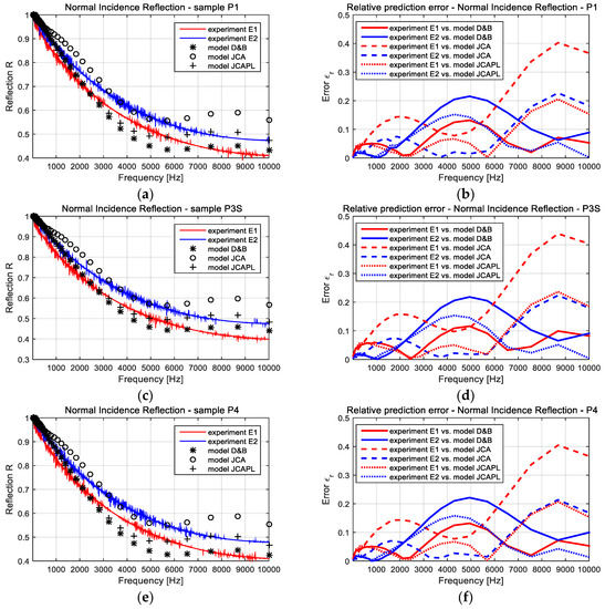 Comparative results between evaluated and computational estimated normal incidence reflection coefficients. (a) Reflection for sample P1; (b) relative prediction error for sample P1; (c) reflection for sample P3S; (d) relative prediction error for sample P3S; (e) reflection for sample P4; and (f) relative prediction error for sample P4. The significations of the symbols within graphs were mentioned on each diagram legend.