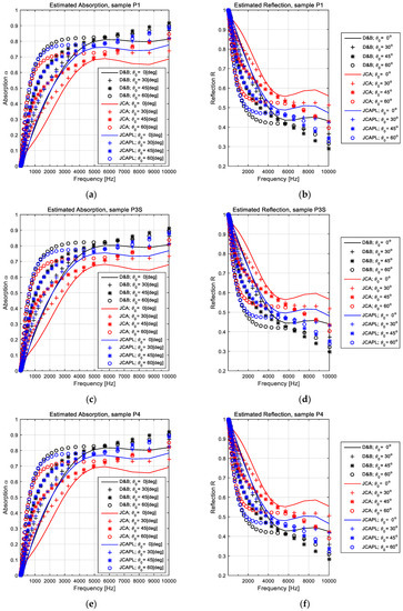 Parametrical evolutions of absorption α and reflection R coefficients respectively, with respect to the sound incidence angle θ0. (a) α for sample P1; (b) R for sample P1; (c) α for sample P3S; (d) R for sample P3S; (e) α for sample P4; and (f) R for sample P4. The significations of the symbols within graphs were mentioned on each diagram legend.
