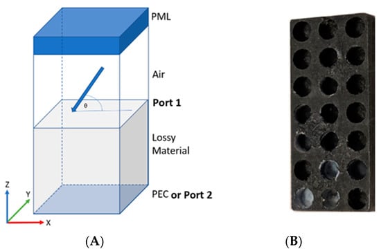 (A) Schematic of unit cell used in COMSOL simulations. The top of the cell is truncated with a perfectly matched layer (PML) to prevent reflections at the top boundary. EM waves with incident angle θ are generated from Port 1 and are incident upon a lossy material with predefined permittivity and permeability. The bottom of the cell is either backed by a perfect electrical conductor or a second port. The unit cell is periodic in the x/y direction and finite in the z direction. (B) A representative xGNP/PLA sample after being machined. The periodic porous array is milled on two separate halves which are then bonded together to form completely encapsulated pores.