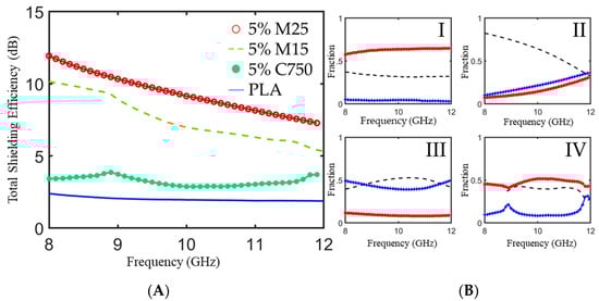 Figure 5 shows the SET and power balance for 3 mm thick PLA composites with different aspect ratio xGNPs measured in a waveguide over the X-Band. As illustrated in Figure 5A, SET increases with increasing xGNP aspect ratio over the entire frequency range with a minimum of 12 dB at 8 GHz for the M25/PLA composite. The observed trends and measured SET for xGNP/PLA composites resemble those of xGNP/PBAT composites with similar complex electromagnetic parameters [35]. For M15 and M25 composites, SET decreases with increasing frequency, which is a phenomenon that has been observed in other conductive polymer composites [36,37]. C750 and PLA exhibited minimal frequency dependence for SET in this frequency range. Yang et al. observed the SE of carbon-non fiber/polystyrene foams and found that at loadings of 10% and higher there was a dependence on frequency but did not see the same effect with lower loadings of carbon nanofiber [37].