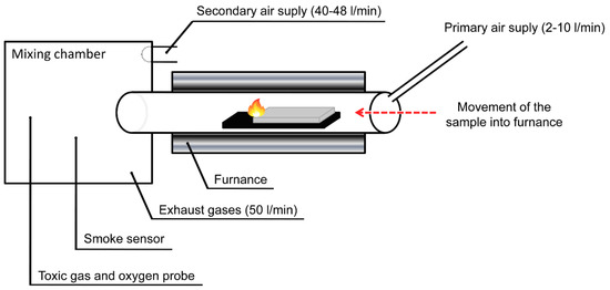 The nature and quantity of the thermal degradation products of selected composites based on epoxy resins with agricultural waste materials were determined using a steady state tube furnace (Purser furnace) and a gas chromatography with a mass selective detector (Agilent Technologies 7890 A GC MSD 5975, Santa Clara, CA, US), in accordance with the ISO TS 19700 standard (Figure 1). The 5 g samples of materials were combusted at 650 °C. The fire effluents were taken from the mixing chamber of the tube furnace using the solid phase microextraction technique and carboxen/polydimethylsiloxane fibre coating, since it is recommended for the extraction of both non-polar and polar chemicals. The chromatographic separation was achieved with an HP-5 MS fused silica capillary column. Chromatographic peaks were identified through comparing the mass ions of each peak with NIST MS Library. As the chromatographic peak area of a specific compound is linearly correlated with its quantity, its concentration can be reflected by the peak area ratio. The summed identified peak areas were normalized to 100% and the relative abundance of a specific compound can be reflected by its peak area ratio.