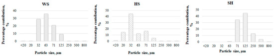 Figure 2 presents the grain size distribution of ground shell and husk in relation to the mass of material that remained on individual sieves. It was found that 86% of the particles of WS and 73% of the particles of HS ranged between 32 and 71μm in size. The highest share of relatively large grain, for which as many as 62% of particles were above 71μm, was determined for ground SH. The most uniform grain size distribution, with more than 99% of the particles between 32–250 μm, was recorded for WS [16]. Nevertheless, it can be assumed that a fairly homogeneous size distribution characterizes all of the investigated fillers.