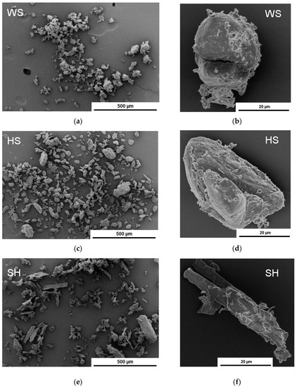 The morphology of the particles of the analysed natural waste plant fillers was assessed based on SEM images. The analysis of SEM images (Figure 3) confirmed that the particles that were obtained as a result of grinding WS, HS, and SH differed in size (Figure 3a,e) and geometry (Figure 3c). The greatest differences in the appearance of particles were observed between shell and husk, due to the different construction of such complex structures and their behaviour during the grinding process. The particles of ground shell resembled a sphere (Figure 3b), and moreover their surface was rough to varying degrees. In contrast, the particles of ground SH looked like short fibres, due to their longitudinal shape. Surface roughness impedes its proper wetting by the polymer matrix in the course of processing, thereby contributing to the formation of voids at the interface. The problem mostly refers to polymers with high viscosity. On the other hand, the well-developed surface of the particles increases the contact surface of the components and it enables their mechanical linkage [19,20,21].