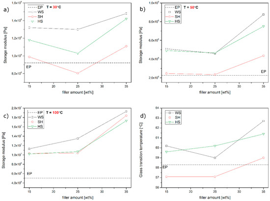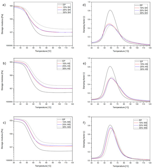 In Figure 5, the results of the thermo-mechanical evaluation of the composites are presented. The values of the storage modulus (G’) and damping factor (tanδ) are presented on separate graphs as a function of temperature (T) measured for unmodified epoxy resin cast samples and epoxy-based composites that were filled with various amounts of the three analysed natural fillers. As can be seen in Figure 5a–c, the incorporation of all the natural lignocellulosic fillers that were used in this study caused an increase in the composites stiffness in almost the whole considered temperature range in comparison to the unmodified polymer. This effect may be attributed to the presence of rigid filler structures that are dispersed in a polymeric matrix, which allows the composite sample to accomplish an effective stress transfer despite the softening of the epoxy resin. This effect is due to the increasing molecular chains mobility at elevated temperatures. The only deviation from this tendency was observed for samples containing 25 wt % of the ground SH. In this case, the effect of stiffness improvement was observed above 48 °C, that is, at the beginning of the composite glass transition. Usually, the storage modulus vs. temperature curve of fully cured epoxy resin and its composites consists of three temperature-dependent distinct regions: a glassy region at a low temperature, an intensive drop of storage modulus corresponding to α-relaxation, and a rubbery plateau at a high temperature [23,24,25]. The extended stiffness of composite samples at a glassy region is an effect of effective reinforcement of the polymer by natural filler, which improves the epoxy resin’s ability to support the mechanical strains with recoverable deformation [24]. The comparison of the storage modulus values that were measured at selected temperature (30, 50, and 100 °C) is presented in Figure 6a–c. The highest storage modulus was observed for the composites that were modified with ground WS. As was described in our previous work, the incorporation of this filler type into the epoxy resin provides a significant modification of the mechanical properties of the composites [26]. An increase in G’ value is a simultaneous effect of the filler stiffness, which enables an effective stress transfer during the load and interfacial bonding between the composite components [16]. The lowest stiffness of the composites was observed for epoxy castings filled with SH, and the biggest difference was observed at 50 °C. Those results are reasonable if they are discussed in reference to the measured composites glass transition temperature (Figure 6d). The glass transition temperature (Tg) of epoxy-based composites was determined at a peak of tanδ vs. T curves presented in Figure 5d–f. Detailed information regarding Tg is presented in the aforementioned Figure 6d. The incorporation of ground WS and HS results in an increase in the epoxy-based composites glass transition temperature, whereas the opposite tendency was denoted in the case of SH-filled composites. This phenomenon may be attributed to the chemical structure of the filler, as well as the shape of ground organic particles. The main difference in the chemical structure of the fillers used in this study is connected to the amount of lignin and fat [21]. Lignin is responsible for lingo-cellulosic material stiffness. A higher amount of lignin in organic fillers (HS 38 wt % and WS 35 wt %) results in an increased stiffness of those fillers in comparison to SH, which only contains 22 wt % of lignin [20]. What is interesting, the self-standing lignin that is incorporated into the polymeric matrix as a filler may be effective plasticizing agent [27,28]. Figure 6d shows the different effects of various organic fillers added to epoxy-based composites, whose glass transition temperature is mostly connected with the amount of fat in the agricultural waste plant fillers: the higher amount of fat, the lower glass transition temperature. In the case of SH composites that contain 8% of fat [21], glass transition temperatures were the lowest. The tendency in glass transition changes that were evaluated by DMA are in a good agreement with the experiments conducted with differential scanning calorimetry (DSC) described in our previous work [17]. It cannot be excluded that the observed lowered Tg in the case of SH-filled composites is partially connected with insufficient adhesion between the polymeric matrix and the filler, as well as increased porosity that is caused by hindered degassing in case of SH composites containing short fibre-shaped fillers. However, due to the observation of glass transition reduction effect by two different methods it can be stated that the dominant effect in the case the thermo-mechanical properties modification of SH-filled composites is caused by residual fat and oil migration. Effective plasticization of the polymer usually results in a simultaneously observed decrease of the Tg and an increase in the tanδ value at the peak as a result of the increased damping properties of the modified material. High amounts of fat in SH, which partially migrate from the organic particle to an interfacial region, provide a limitation in reactivity between the organic filler and the thermoset polymeric matrix, which may occur during the curing [26]. Higher values of the tanδ that were measured at α-relaxation may be related to poorer interfacial bonding between the matrix and the filler, which results in a higher mechanical energy dissipation [23]. On the basis of our previous studies concerning the effect of the filler shape, as well as migration of the fat and oil from agricultural filler on various polymers [17,29,30], it can be concluded that the reinforcing effect in the thermo-mechanical behaviour of the composites containing particle-shaped fillers may be suppressed by oil migration, resulting in simultaneously occurring plasticization of the polymeric mat