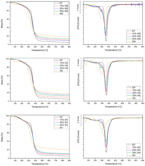 The thermal stability of the composites was defined on the basis of temperatures corresponding to 5%, 10%, and 50% mass loss read from the TG curves. The onset temperature of degradation (5% mass loss) was subject to growth that was correlated with the increase in the amount of plant component, and the highest value (higher by 18 °C when compared to EP) was determined for the composites containing 35 wt % WS and 35 wt % HS. Different results were only noted in the SH series, for which the temperature was lower when compared to EP and decreased as the content of husk increased, which is probably related to the largest contribution of secondary components, i.e., fats and protein [21]. The temperature of 5% mass loss was above 150 °C, regardless of the type and amount of the natural component, which is higher than the expected temperature of utilization of the final products. Based on the analysis of the values corresponding to 10% mass loss (Table 2) and the course of TG curves of composites with shell (Figure 7), it was found that the materials have higher thermal stability in the temperature range up to 300 °C when compared to the unmodified epoxy resin. Probably, the improved thermal stability of the composites was related to the modified curing process of epoxy composites, as described in our previous work [16]. However, in the case of the temperature corresponding to 50% mass loss, the values that were obtained for the resin and composites were similar, which is probably related to the intense degradation of all the components (including the polymer matrix) at this stage of the test. Interestingly, slightly higher values were obtained for the SH series among the composites, unlike in the case of temperatures corresponding to 5% and 10% mass loss.