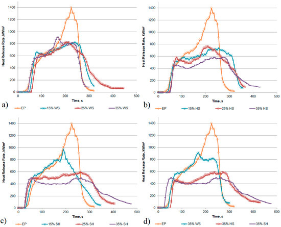 Heat Release Rate (HRR) is the single most important variable to evaluate fire safety of materials [36]. The representative heat release curves of epoxy resin and epoxy-based composites that were filled with different amount of shell or husk are presented in Figure 8. It was found that the curves of unmodified polymer were characterized by one single peak with the value of 1156 kW/m2, while the HRR of composites in most cases showed a broad shoulder without a well-defined peak. The incorporation of plant waste fillers into the epoxy matrix caused a decrease in the peak of Heat Release Rate (pHRR) values in comparison to the polymer (Table 3). For instance, the values of pHRR for sunflower pellets reached 192 kW/m2 in the article [37], which is much lower when compared to epoxy resin. The application of 15 wt % of less combustibility filler caused a slight reduction in the heat release rate, while increasing its amount by additional several percent resulted in a sharp reduction of the analysed parameter. For composite materials that were modified with 35 wt % of the ground sunflower husk the pHRR value, mainly about 520 kW/m2, was almost twice lower in comparison to the EP sample (Figure 8d). The addition of the filler causes a reduction in the pHRR values, which is attributed to the formation of carbonaceous char (approx. 14% fire residue from the initial mass in the case of composites with the highest amount of the filler). The lack of a clear dependence, according to which the pHRR values linearly decrease with the increase in SH share, results from the fact that it is not a commercial product with strictly defined composition and properties. Moreover, only a larger amount of filler causes the formation of char, which covers a significant part of the sample and it can effectively protect the polymer.