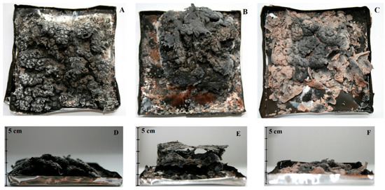 Photographs of selected materials after a cone calorimetry tests: 35 wt % WS (A,D), 35 wt % HS (B,E), and 35 wt % SH (C,F).