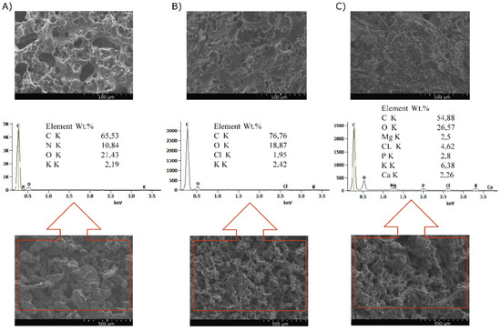 SEM images of the char residue of 35 wt % WS (A), 35 wt % HS (B), 35 wt % SH (C) (top—magnification ×500 and bottom—magnification ×100).