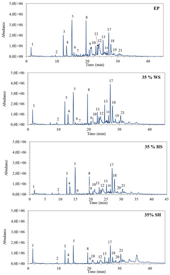 The results that were obtained while using a Purser furnace and a GC-MS show that the amount and number of products released during the degradation of selected composites depend on the type of agricultural waste material used for the modification (Figure 11). The materials designated as 35 wt % WS behaved similarly to the unmodified epoxy resin (EP), while a significant decrease in the quantity and number of emitted products was observed for composites with HS and SH (29 and 26 compounds were detected in the samples of thermal degradation products of composite with 35 wt % HS and 35 wt % SH). However, the significant increase in the non-flammable production (COx, NOx, and H2O), diluting the oxidant in fire zone and inhibiting the combustion process, was recorded for composite with 35 wt % WS.
