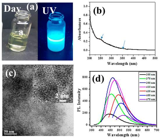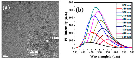 - Wang, J.; Zhang, P.; Huang, C.; Liu, G.; Leung, K.C.; Wa, J. High Performance Photoluminescent Carbon Dots for In Vitro and In Vivo Bioimaging: Effect of Nitrogen Doping Ratios. Langmuir 2015, 31, 8063–8073. [Google Scholar] [CrossRef]