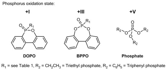 For PIR, additive tris(2-chloro isopropyl)phosphate (TCPP) is the state-of-the-art flame retardant (FR) [,]. It combines both halogen and phosphate in one molecule and it leads to a good balance in gas phase versus solid phase FR action in the resulting foams. TCPP also lowers the viscosity of the formulation for improved processing and plasticizes the foam []. However, there is interest in halogen-free FRs to comply with certain eco-labels, for instance the label “pure life” []. Phosphorus (P)-containing molecules are considered to be substitutes for halogenated FRs [,,]. Phosphorus offers a variety of structures with different oxidation states of the phosphorus atom []. Generally speaking, the mode of action, i.e., gas phase versus solid phase action, is dominated by two aspects for phosphorous based flame retardants [,,,,]. First, the oxidation state of the phosphorus atom in the compounds plays a decisive role. If the phosphorus atom has a high oxidation state a thermally stable char is more likely to be formed and the emission of P-containing gases (gas phase mechanism) is low. If the phosphorus oxidation state is low, P-containing gases are more likely to be released. Gas phase action is strongest for phosphine oxides and low for phosphonates []. Secondly, the volatility of the FR impacts the gas phase activity []. Balancing gas phase and condensed phase activity in polymer materials is important to tune FR performance and comply with safety standards [,,].