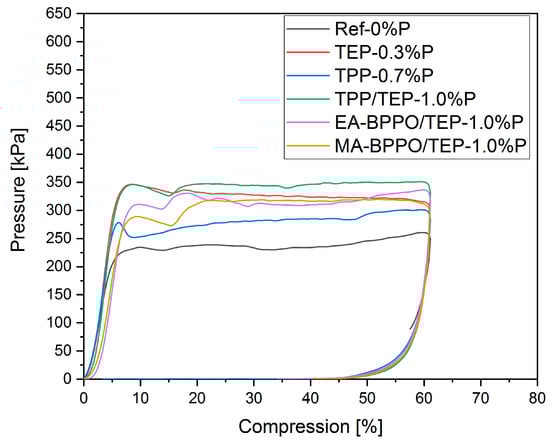 The mechanical behavior of the selected foams was examined by the compression test until a maximum compression of 60% (Table 4, Figure 4 and Figure S4). In the control foam Ref-0%P, the maximum force Fmax of approximately 270 kPa was reached at low compression. The addition of TEP in TEP-0.3%P resulted in an increase of Fmax to about 350 kPa. The foam TPP-0.7%P without TEP, but with TPP showed, as expected, a lower maximum force that was comparable to Ref-0%P. Substitution of TPP by the BPPO-containing FR additives induced slight changes to the compression strength as compared to TPP/TEP-1.0%P with EA-BPPO/TEP-1.0%P having Fmax at slightly higher value and MA-BPPO/TEP-1.0%P having Fmax at a slightly lower value. It seems to be surprising that a plasticizer, like TEP, led to higher compression strength. This effect can be explained by the reduction of the glass transition temperature Tg by TEP with reaction time (Tg = f(treaction)). The improvement in mobility of polymer chains during the polymerization led to increased levels of diffusion-controlled trimerization. Higher degrees of trimerization induce higher crosslinking densities, and this is visible in the compression strength.