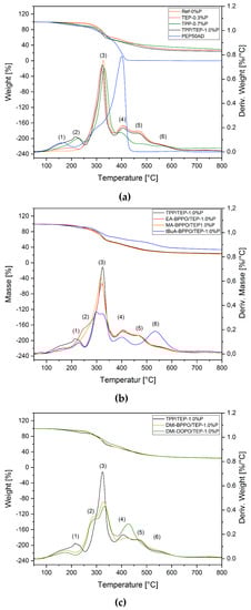 The addition of TEP in TEP-0.3%P and TPP/TEP-1.0%P (Figure 5a) did not alter the main decomposition maximum (3) in the temperature range of 320 °C, but induced a new maximum (1) at a lower temperature (192 °C). This maximum is connected to the vaporization of TEP, as reported previously [] and proven by pyrolysis-GC/MS (Supplementary Materials, Table S4). Consequently, it was found in all samples containing TEP.