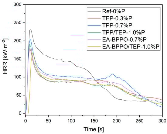 Figure 6 compares the HRR over time of foam Ref-0%P to foams with EA-BPPO, TEP, and TPP. The curve for the control foam Ref-0%P is roughly comparable with that results that were reported in the literature [], although the pentane levels in the cells here and in the literature differ significantly. The foam TEP-0.3%P showed a reduction of HRR in the steady burning phase between 50 and 275 s. The addition of TPP in TPP/TEP-1.0%P did not alter the first phase of burning until 200 s, but it reduced the HRR after this time. When TPP was substituted by EA-BPPO in EA-BPPO/TEP-1.0%P the pentane-related first peak appeared later, as desired, and it was lower than for the benchmark foam TPP/TEP-1.0%P.