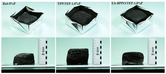 The foams were analyzed by ATR-FTIR spectroscopy. The FTIR spectra of the foams are shown in the Supporting Information (Figures S1 and S2). The spectrum of the pure EA-BPPO (Figure S3 in the Supplementary Materials) showed intense bands at 717 (P-C stretching), 925 (P-Ar), and 1242 cm−1 (P=O stretching) []. In the FTIR spectrum of foam EA-BPPO/TEP-1.0%P with 7 wt.% EA-BPPO (matching 1 wt.% phosphorus in the foam) the same bands appeared with weaker intensity. The stretching vibration bands for urethane at 1218 cm−1 and isocyanurate at 1405 cm−1 indicated the successful reaction of the isocyanate groups with aliphatic OH groups of the polyol []. A residue of non-reacted isocyanate groups was observed at 2273 cm−1. This is due to the high NCO index of 3.2 that is necessary for generating isocyanurate rings [].