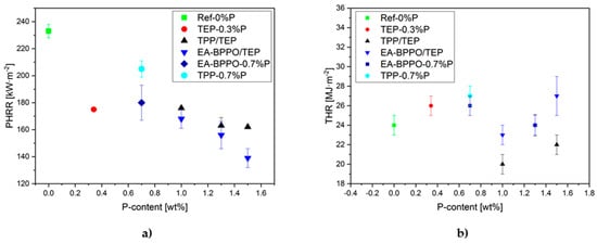 The addition of TEP resulted in a drastic decrease in PHRR (TEP-0.3%P). Further addition of TPP in TPP/TEP-1.0%P formulation did not alter the PHRR. The same applies for MARHE. The substitution of TPP by the BPPO derivatives to meet the comparable P-content (1 wt.%) yielded PHRR and MARHE values that were comparable to TPP/TEP-1.0%P. The PHRR values that were found correlated to the P-content, except for MA-BPPO/TEP-1.4%P, Figure 8. THR was hardly influenced by all the additives that we ascribe to the comparable P-contents and the comparable amount of burnt material. The effective heat of combustion was also hardly affected by the type of FR additives.