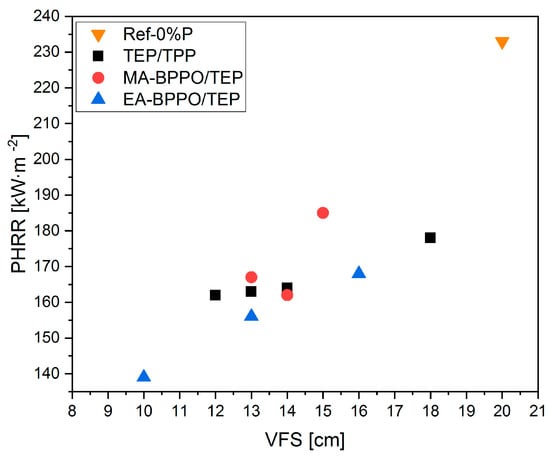 Correlation between PHRR and VFS of the reference foams, MA-BPPO/TEP, and EA-BPPO/TEP.
