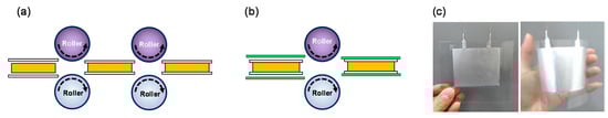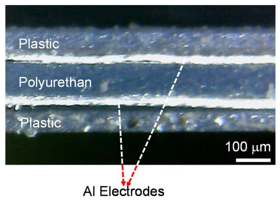 Figure 1 shows a graphical illustration of the flexible sensor where a capacitor structure was utilized because of its simple structure, good stability, and low power consumption [3,9,10,11,12]. For sensor fabrication, aluminum (Al) foil electrodes purchased from Sigma-Aldrich (resistivity of 2.6548 μΩcm; thickness of 30 μm, Singapore) were initially sputter-etched to remove potential contamination or native oxide structures. In short, the Al foil was loaded in the etching chamber, under a vacuum background of 10−6 Torr. Subsequently, argon gas with a flow rate of 20 sccm is inlet into the chamber, and the etching pressure is controlled to be 0.1 Pa. An automatic tuning process is applied to generate plasma atmosphere, and to start an etching process. The etching power is set to be 30 W, corresponding to the etching rate of 0.5 nm/min. For our case, we performed this cleaning process about 5–10 min to ensure a perfect conductive surface of Al foil. A 100-μm-thick polymer film of polyurethane (Tensile strength = 38 Mpa, Sanyo Chemical, Tokyo, Japan) was employed as an active layer, which was sandwiched between two aluminum electrodes, followed by lamination at 80 °C twice (Figure 2a). The sensor size was determined by the overlapping area of the two electrodes to be 70 mm × 70 mm. This large size was used with the aim of being suitable for an application in car tire tracking. Subsequently, a copper wire was attached to the electrode to form the connecting lead of the sensor. Finally, for protection, the sensor was also covered with a plastic film by the lamination method at 80 °C (Figure 2b). The rollers of the laminator in here are to help to flatten sandwiched polymer and increase the adhesive functionality. Figure 2c shows photos of the fabricated sensor in a (left) normal or (right) flexible mode. To examine the homogeneity of sensor layer after lamination, a cross-sectional image of the sensor was taken with a microscope. As can be seen in Figure 3, each layer is well realized, indicating a homogenous property of device layer.