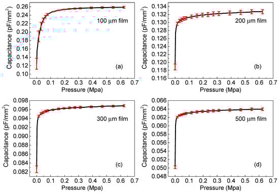 Capacitance-pressure characteristics of sensors with thicknesses of (a) 100, (b) 200, (c) 300, and (d) 500 μm.