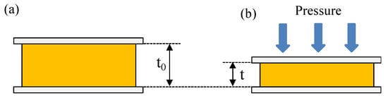 where ε, A, and t are the dielectric constant, the area of overlap of the two electrodes, and the thickness of the dielectric layer (or the distance between the electrodes), respectively. As shown by Equation (1), under application of pressure, the change in C can be considered for the following reasons: (1) a change in the dielectric constant of the dielectric layer, (2) a change in the device area, or (3) a change in the distance between two electrodes. However, mechanism (1) can be neglected because the dielectric constant of the polymer material obtained during the sensor under compression was almost unchanged to be about 2.2. If the device area change is the reason, the capacitance has difficulty rapidly increasing like in curve Figure 4. Thus, we assume that the decrease in the thickness thanks to the elasticity of the polymer is attributed to the operating mechanism. Based on that consideration, the proposed operation mechanism of the sensor is presented in Figure 5. Under application of force to the sensor electrode, the thickness of the film decreases, which, in turn, results in the capacitance increasing in accordance with Equation (1). In contrast, the applied force is removed from the interface; consequently, the capacitance reverts to the initial value.