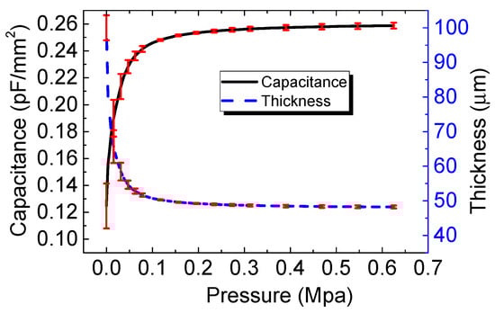 Figure 4 shows the capacitance-pressure characteristics of the sensors when the pressure varies from 0 to 0.65 Mpa. The initial capacitance values were measured to be 0.13, 0.19, 0.083, and 0.050 pF/mm2 from the devices with polyurethane thicknesses of 100, 200, 300, and 500 μm, respectively. A steep increment in capacitance was observed at the low-pressure region and the increment tended to saturate with an increasing applied pressure (p). A similar characteristic is also typical among capacitive sensor systems [17,19,20,21], suggesting that our device sensors were well fabricated.