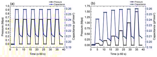 In order to confirm the reproducibility of the change in capacitance values under constant p, the repeatable properties of the sensor in response to a constant p of 0.65 Mpa were checked with the 100 μm based-sensor (Figure 7). In the first cycle, capacitance at p = 0 Mpa was not returned to the initial value when the pressure was released. This would be due to the deformation of the polyurethane film. However, in the second cycle, the repeatable characteristics were well observed as shown in Figure 7a. Moreover, a pressure-sensing characteristics under various values of p were investigated, wherein the p values of 0.08, 0.2, 0.65, 1.0, and 1.5 Mpa were applied. As can be seen in Figure 7b, the sensor presents stable responses with a great repeatability. Overall, the sensors can be considered durable for the pressure and available for vehicle sensing.