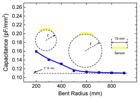 Measured capacitance of capacitor sensor at different bent radius. Inset shows illustration of flexible operation at different bent radius.
