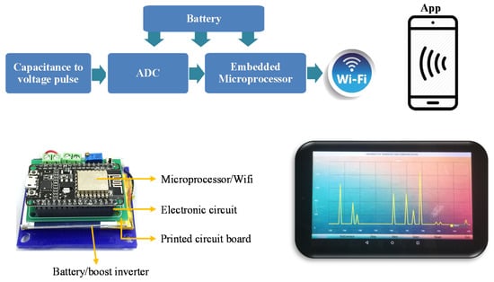 For the purpose of the field test using the flexible pressure sensor, a completed electronic system using the sensor and a wireless DAQ was designed with the circuit diagram presented in Figure 9, where a NE555 based-oscillator [27,28] was utilized to convert the sensing capacitance to a pulse train and then digitized with a 10-bit-ADC (analog-to-digital converter). With the aim of constructing a DAQ with a small size and low-power, an IoT microprocessor of L106 32-bit RISC and IEEE 802.11 b/g/n integrated in the ESP8266 module were used. An embedded code for the microprocessor chip was written to process, store, and transmit the sensed data to the tablet computer through a WiFi method. The power supply for the DAQ circuits in DAQ was provided from a 3.7 V-LiPo rechargeable battery. A tablet app written with Android Studio allowed real-time display of the sensed signal and export of the data in Excel format for further analysis. We note that since capacitance might not be returned to the initial value when the pressure was released after the first cycle as shown in Figure 7a, the signal data were normalized before displaying on Tablet.