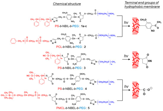 All reagents were purchased from Wako Pure Chemical Industries Ltd. (Osaka, Japan), TCI Co., Ltd. (Tokyo, Japan), Sigma-Aldrich (St. Louis, MO, USA), or Kanto Chemical Co., Inc. (Tokyo, Japan), unless otherwise stated. Photodegradable diblock copolymers (PS-b-NBIL-b-PEG 1a–c, PCL-b-NBIL-b-PEG 2, and PEG-b-NBIL-b-PS 3) were synthesized according to the reported methods [25,26].