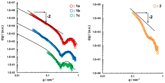 To confirm the formation of the characteristic hollow spherical structures of the polymersomes, we analyzed them by SAXS. The profile and the structural parameters are shown in Figure 4. For all analyzed samples, the SAXS profiles agreed with the model fitting of the vesicle and the scattering vector was q−2, which indicated a vesicle structure [29]. The core radius for half layer thickness of the hydrophobic shell of the polymersomes 1a–c and 2 was 3.3, 4.3, 5.2, and 9.5 nm, respectively. In PS-based polymersomes, the hydrophobic shell thickness increased depending on the extension of the hydrophobic chain length. On the other hand, when the shell thickness was compared for the polymersomes bearing different hydrophobic blocks, i.e., PS and PCL, the half layer thickness of the PCL-based polymersome 2 was found to be twice as long as that of the PS-based polymersomes 1b. These results are reasonable considering the closer solubility parameter of PCL to water than that of PS. Moreover, the thickness of the PEG chains calculated from the difference between the hydrophobic shell and the total shell thickness was almost identical, which was consistent with the same molecular weight of PEG in the block copolymers.