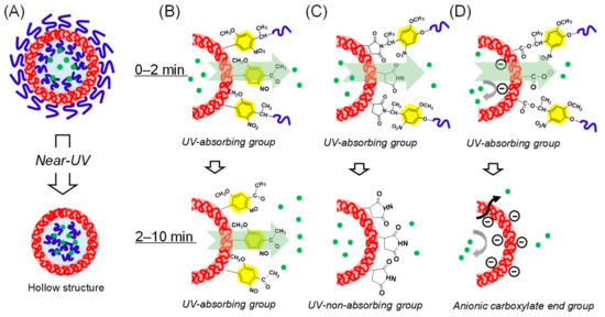 In the second type, the photocleavable group is introduced as a junction of hydrophobic and hydrophilic blocks. The first report for this “linker-type” was made by Burdick and coworkers with the PEG-PCL deblock [21], later followed by Meier and coworkers with the hydrophilic PAA and hydrophobic poly(methylcaprolactone) (PMCL) segments [22,23]. Interestingly, these polymersomes reportedly follow different pathways of decomposition as well as photoreleasing processes in response to photoirradiation. Specifically, the former polymersomes retain their hollow structures, which gradually collapse with thickened shells and lead to the expulsion of aqueous contents. On the other hand, the latter polymersomes disassemble into smaller micelles associated with the release of aqueous contents. The authors concluded that the major driving force for the decomposition was the electrostatic repulsion between the photochemically produced anionic carboxy group at the end of the hydrophobic blocks, even though the same anionic group was formed in the PEG-PMCL diblock as well [24].