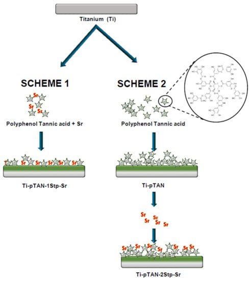 Schematic representation of the workflow of Ti-pTAN-1Stp-Sr and Ti-pTAN-2tp-Sr coatings.
