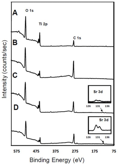 XPS wide spectra scan of (A) Ti; (B) Ti-pTAN; (C) Ti-pTAN-1Stp-Sr; (D) Ti-pTAN-2Stp-Sr.