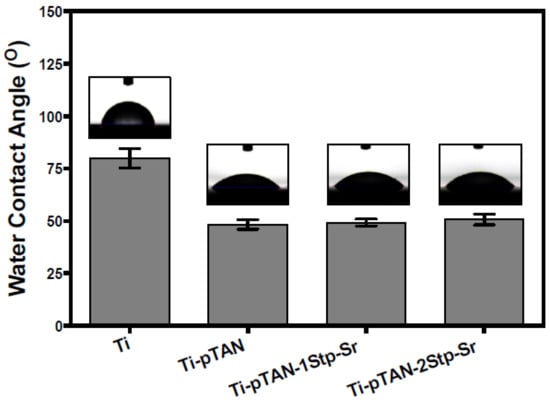 Contact angle analysis of Ti, Ti-pTAN, Ti-pTAN-1Stp-Sr and Ti-pTAN-2Stp-Sr.