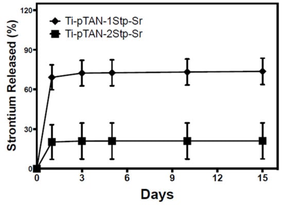 The release of Sr from Ti-pTAN-1Stp-Sr and Ti-pTAN-2Stp-Sr was estimated by ICP-MS. A burst release was observed after 24 h (Figure 4). However, subsequent time points revealed minimal release, with about 20% remaining on Ti-pTAN-1Stp-Sr and about 70% of the immobilized Sr remaining on Ti-pTAN-2Stp-Sr for 2 weeks. This shows that the binding of Sr2+ ions on Ti-pTAN-2Stp-Sr were stronger, compared to Ti-pTAN-1Stp-Sr.