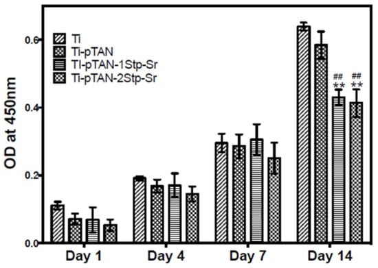 The cell viability of MC3T3-E1 cells on Ti, Ti-pTAN, Ti-pTAN-1Stp-Sr and Ti-pTAN-2Stp-Sr were monitored by CCK-8 assay kit. No difference in cell viability was observed for day 1, day 4 and day 7 of cell culture (Figure 5). However, a statistically significant decrease in cell metabolism was observed on day 14 for the MC3T3-E1 cells cultured on Ti-pTAN-1Stp-Sr and Ti-pTAN-2Stp-Sr as compared to Ti (p < 0.01) and Ti-pTAN (p < 0.01).