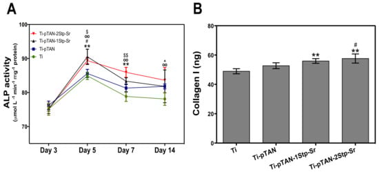 The effects of the substrates on ALP activity of MC3T3-E1 cells were monitored at day 3, day 5, day 7 and day 14 of culture (Figure 6A). For day 3 cultures, ALP activity of osteoblasts on Ti was at a similar level as those on the other substrates. ALP values reached peak at day 5. Osteoblasts on Ti-pTAN-1Stp-Sr and Ti-pTAN-2Stp-Sr had significantly higher ALP activity as compared to Ti (p < 0.01) and pTAN (p < 0.05). From day 7 onwards, decrease in ALP activity was observed. Nevertheless, ALP activity was significantly higher on Ti-pTAN-1Stp-Sr as compared to Ti (p < 0.01), and for Ti-pTAN-2Stp-Sr, the activity was higher as compared to both Ti (p < 0.01) and Ti-pTAN (p < 0.01) at the same time point. ALP activity on day 14 was the lowest for all the substrates, but the activity was still higher on Ti-pTAN-2Stp-Sr (p < 0.01) and Ti-pTAN (p < 0.05) as compared to Ti.