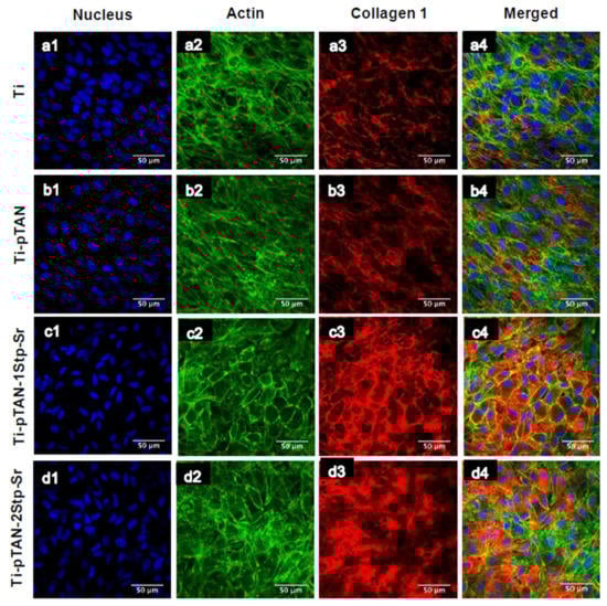 COLL 1 production of osteoblast cultured on Ti-pTAN-1Stp-Sr and Ti-pTAN-2Stp-Sr was statistically higher as compared to osteoblast cultured on Ti (p < 0.01, Figure 6B). Unlike the osteoblasts cultured on Ti-pTAN-1Stp-Sr, the osteoblasts cultured on Ti-pTAN-2Stp-Sr had higher COLL1 secretion as compared to Ti-pTAN (p < 0.05), suggesting superior osteogenic effects of Ti-pTAN-2Stp-Sr over Ti-pTAN-1Stp-Sr. The COLL 1 amounts were statistically similar for osteoblast cultured on Ti and Ti-pTAN. Immunofluorescence labelling of cells further confirmed these results for COLL 1. After 21 days of culture, MC3T3-E1 cells were stained for COLL1 using anti-COLL 1 antibody (Figure 7). MC3T3-E1 cells cultured on Ti-pTAN-1Stp-Sr (Figure 7c3) and Ti-pTAN-2Stp-Sr (Figure 6d3) displayed higher COLL 1 production as compared to cells cultured on Ti (Figure 7a3) and Ti-pTAN (Figure 7b3). Actin staining was also performed for the cells (Figure 7a2,b2,c2,d2) to monitor cell morphology and density. The cells cultured on all the substrates were confluent with uniform cell density. Cuboidal morphology was observed for the cells cultured on Ti-pTAN-1Stp-Sr and Ti-pTAN-2Stp-Sr. But the cells on Ti and Ti-pTAN had fusiform morphologies.