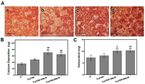 The effect of immobilized Sr on late differentiation markers such as osteocalcin [] and matrix mineralization were investigated after 14 days of culture. Alizarin S stain and calcium estimation were performed to monitor the effects of Sr immobilized substrates on osteoblast mineralization. Stronger alizarin stain was observed on Ti-pTAN-1Stp-Sr (Figure 8Ac) and Ti-pTAN-2Stp-Sr (Figure 8Ad) as compared to Ti (Figure 7Aa) and Ti-pTAN (Figure 7Ab). Similarly, calcium estimated on Ti-pTAN-1Stp-Sr and Ti-pTAN-2Stp-Sr was higher than on Ti (p < 0.01) and Ti-pTAN (p < 0.01) (Figure 8B). Moreover, calcium amounts on Ti-pTAN were elevated as compared to Ti (p < 0.05), suggesting that pTAN coatings have a positive influence on osteoblast mineralization. Osteocalcin production was also higher on Ti-pTAN-1Stp-Sr and Ti-pTAN-2Stp-Sr as compared to Ti (p < 0.01) and Ti-pTAN (p < 0.05 and p < 0.01, respectively).